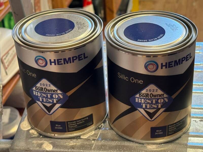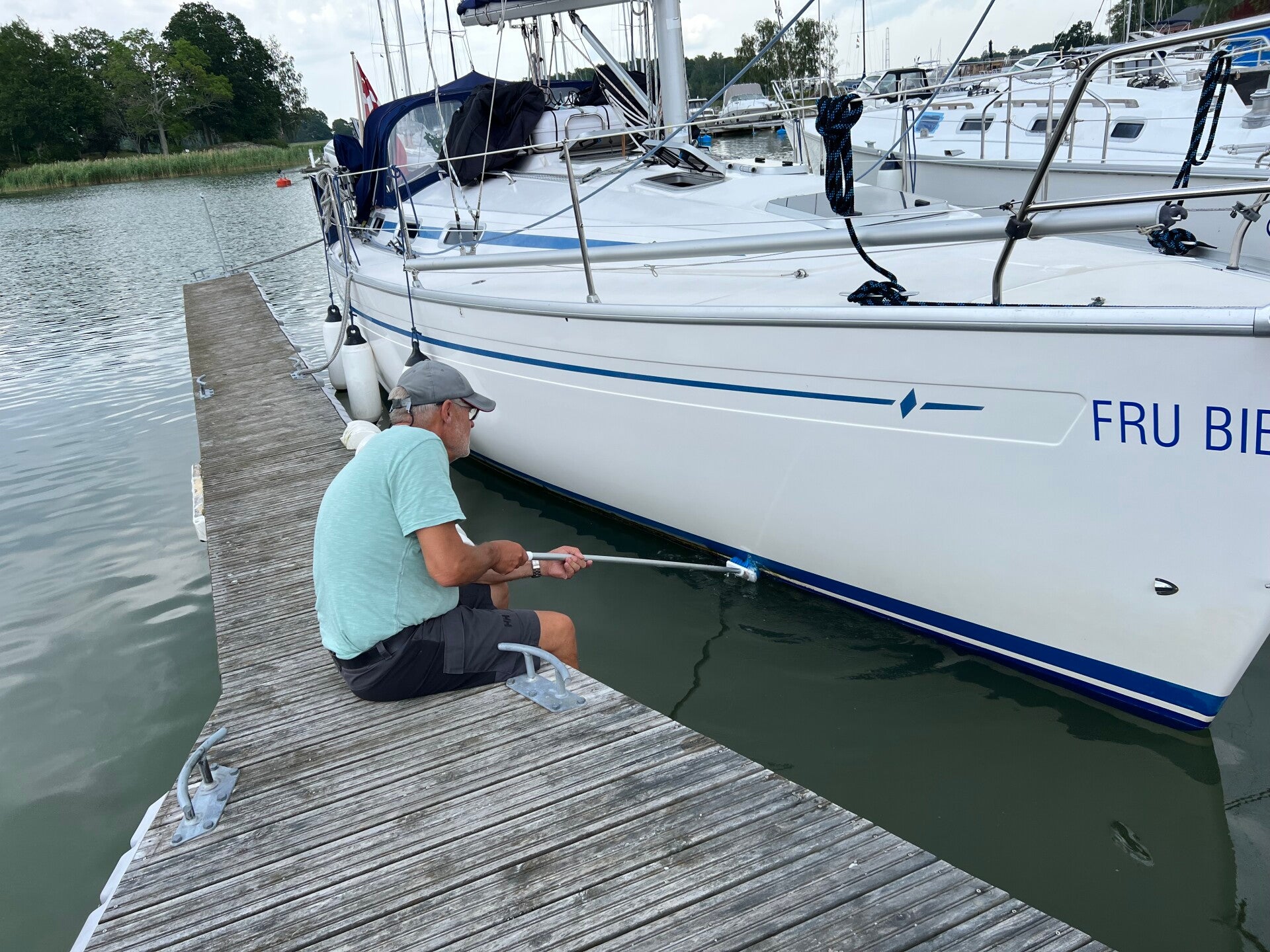 Vi fik Fru Bibi bundmalet med Hempel Silic One, inden hun blev søsat den 25. marts 2025 — og i dag, den 16. juli, fik Finn vandlinjen renset af, fordi den var blevet lidt beskidt efter mange måneder i vandet.