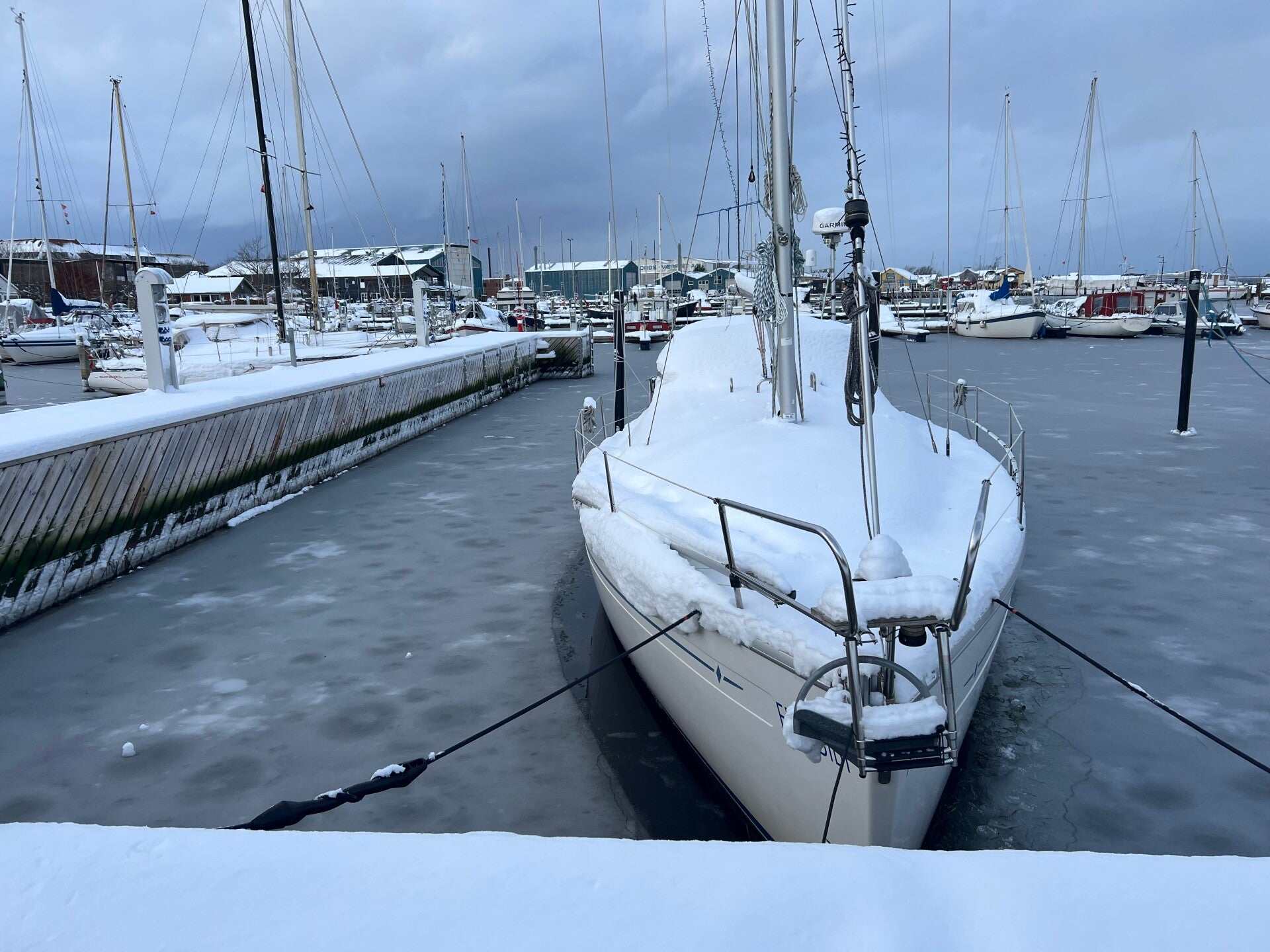 Da vi besluttede, at Fru Bibi skulle overvintre i vandet, havde vi ikke helt forestillet os, hvad der ventede os. Vinteren bed fra sig med frost og sne, og før vi vidste af det, lå vi fastfrosset i isen. Vi gav et par forsigtige ryk i fortøjningerne undervejs – men der var ingen tvivl. Hun sad urokkeligt fast.
