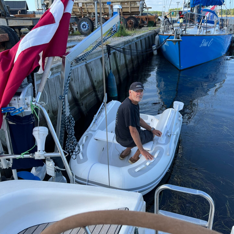 Finn sejlede båden til Aalborg, desværre uden vind, så ingen sejl blev sat. Da Birthe fik fri fra arbejde, kom hun ombord. Vi hentede vores gummibåd på værftet og fik den monteret bag på båden. Klokken 19 gik vi under broerne og sejlede tilbage til Hals, stadig uden vind og derfor ingen sejl. Der var dejligt solskin på begge sejlture, hvilket gjorde oplevelsen behagelig trods manglen på vind. Det var en god dag med sejlads og montering af gummibåden, samt en smuk solskinsdag på vandet.