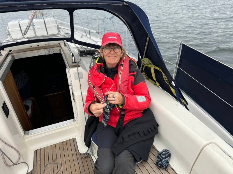 Vi sejlede fra København omkring klokken seks en smuk morgen. Som de optimister vi er, satte vi straks sejl i håb om god vind. Desværre var der ikke meget vind, så vi måtte bruge motoren det meste af vejen. Birthe fandt hurtigt sit strikketøj frem og begyndte at strikke sokker. For hende er strikning ren terapi, især når vi sejler. Efter et par timer blev vi pludselig invaderet af tusindvis af små fluer, som kriblede og krablede overalt. De forsøgte at komme ind alle vegne, hvilket var virkelig irriterende.