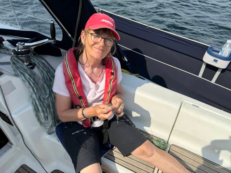 Efter at have passeret broen, satte vi sejl og stoppede motoren, og vi fik en fantastisk sejlads resten af vejen til Kragnæs. Vi fandt hurtigt en god plads, fortøjede, og så var det tid til en kajbajer.