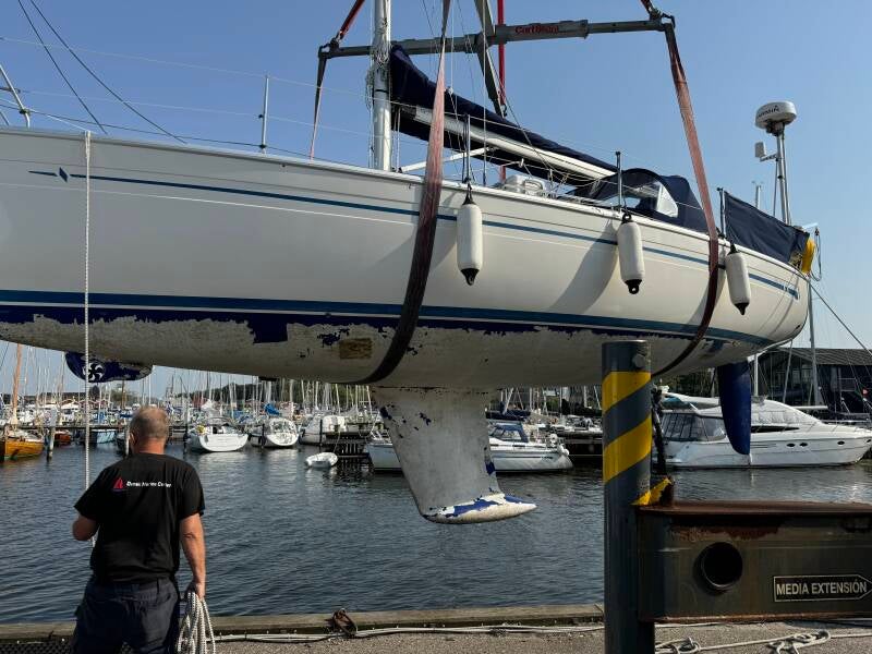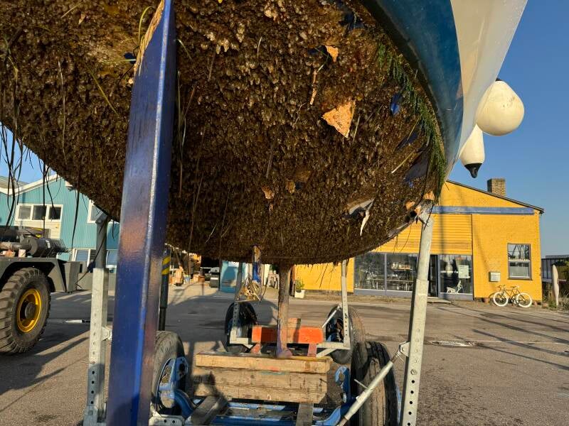 Når båden har været i vandet mellem to lag primer, skal man altid slibe let, før man påfører det næste lag. Det var der desværre ingen, der vidste, så efter at vi havde primet båden med de første fire lag, blev den søsat og sejlet til Aalborg Yacht Værft. Her blev den taget op på land, rengjort efter alle anvisninger, og vi påførte omhyggeligt det sidste lag Light primer – uden at slibe først, da vi jo stadig var inden for de 30 dage.
