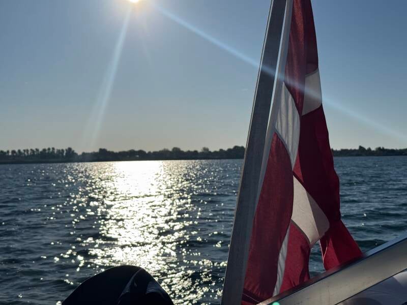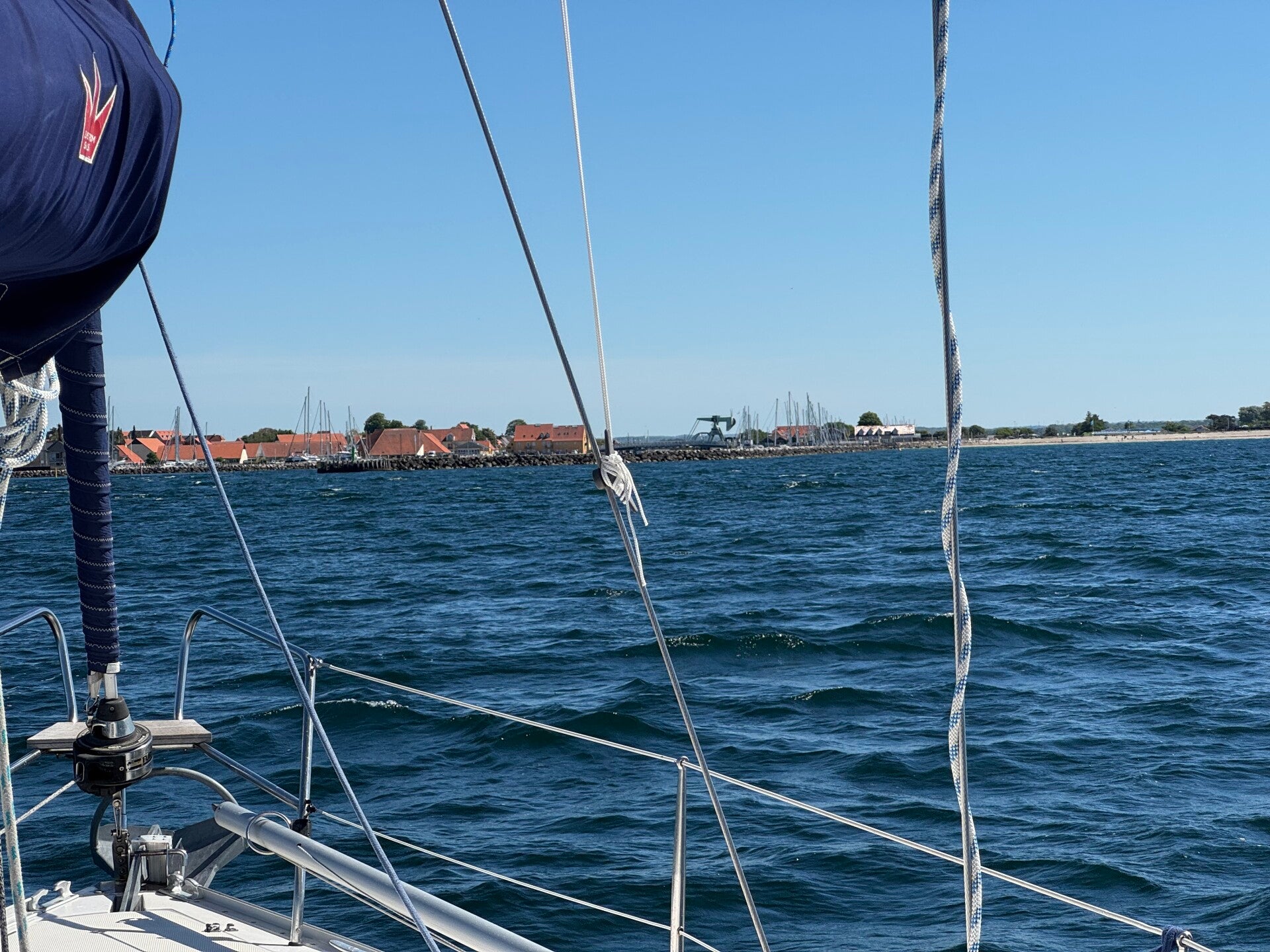 Straks uden for havnen kunne vi sætte sejl og slukke motoren. Vinden var gunstig, og vi fik en herlig start på dagens sejlads. Båden gled støt og godt fremad – en af de der ture, hvor man bare nyder at være til. Men som vi nærmede os Karrebæksminde, faldt vinden til omkring 4 m/s – noget andet end de lovede 8-12 m/s – så motoren måtte i gang for at hjælpe os det sidste stykke.