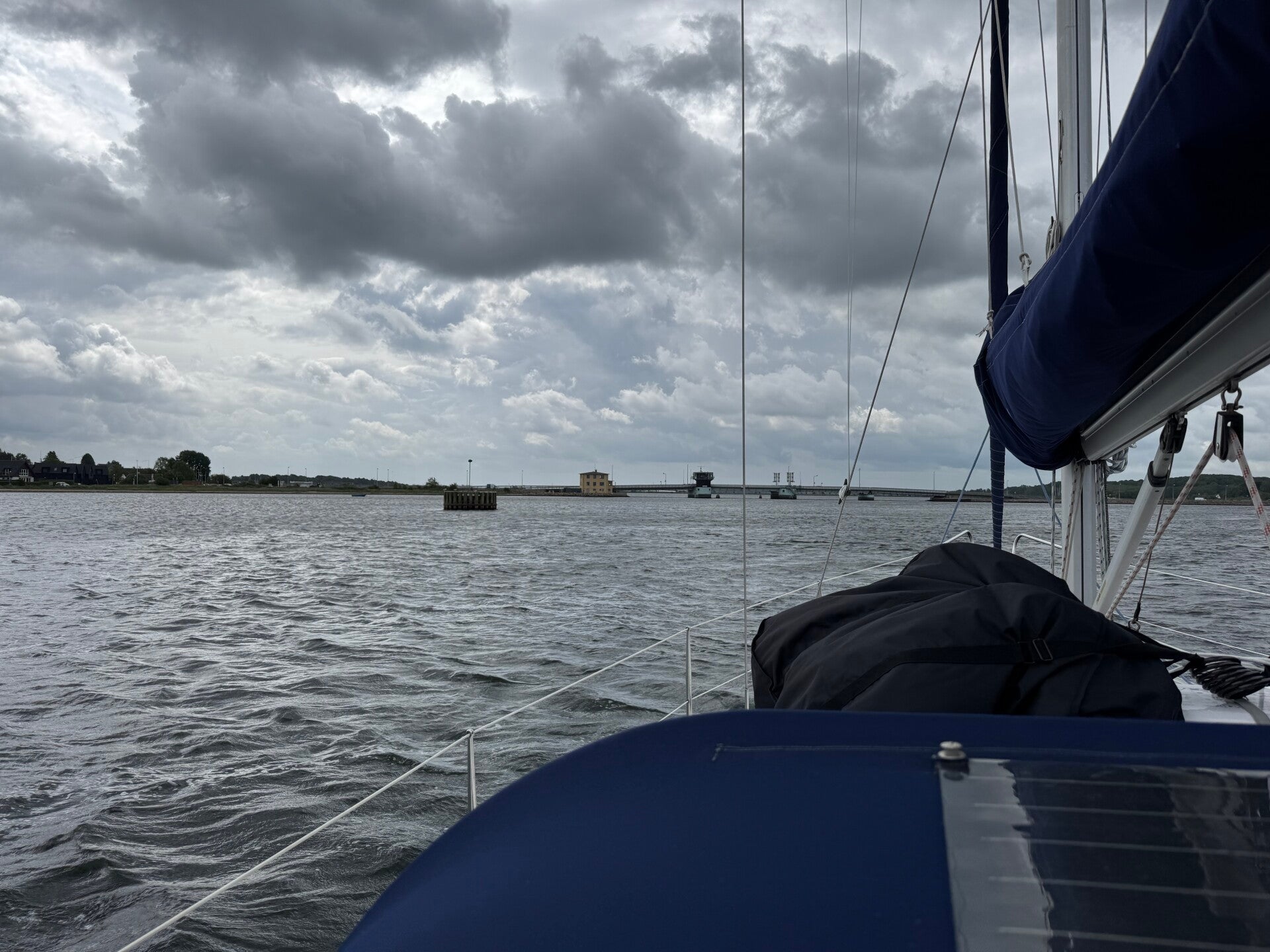 Omkring klokken halv tolv nærmede vi os Kronprins Frederiks Bro, som åbnede for os uden problemer. Der er noget særligt over at sejle gennem en åben bro – som om hele verden lige stopper op et øjeblik for at lade én passere.