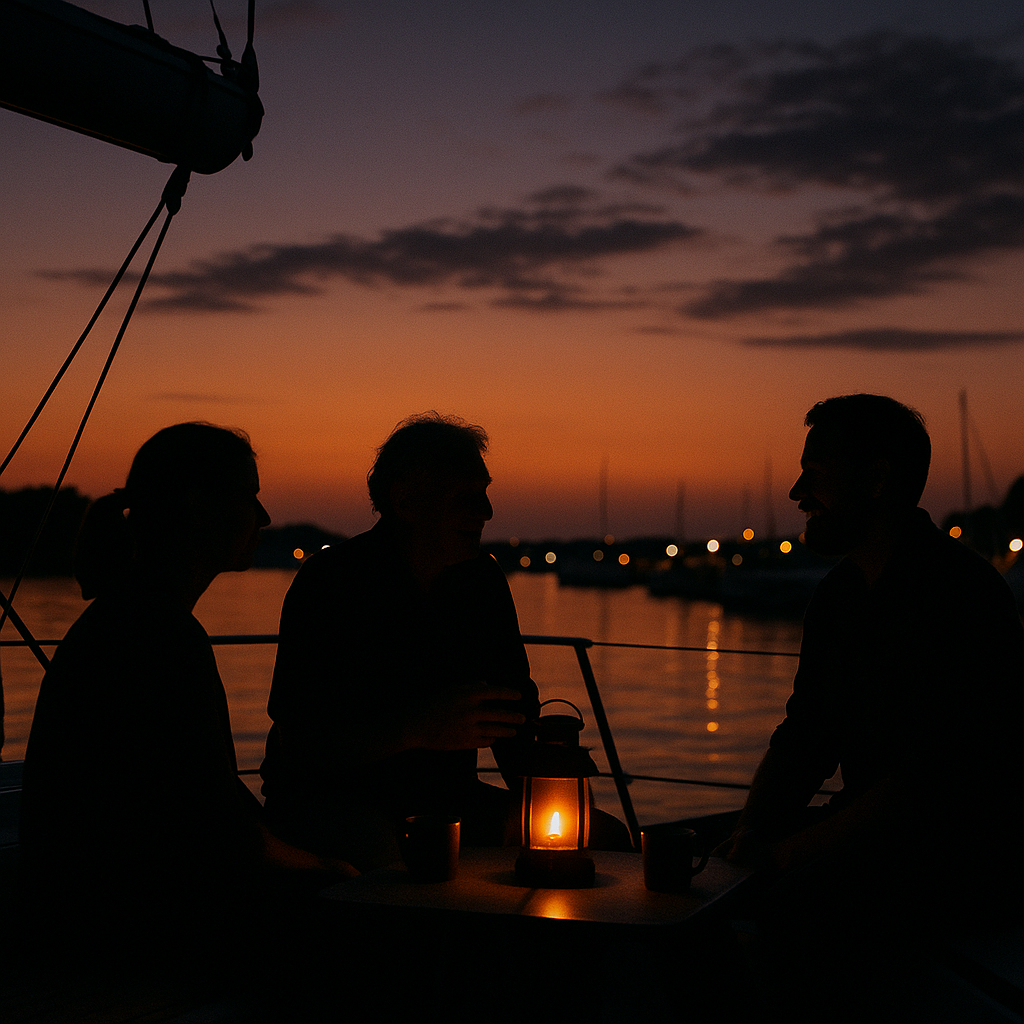 Vi inviterede ham straks ombord, og det blev begyndelsen på et helt særligt øjeblik. Vi satte os til rette og begyndte at tale – ikke om småting, men om livet, om gamle dage, og om alt det, der var sket i de omtrent 50 år, der var gået siden sidst, vi havde krydset hinandens vej. Der var meget at indhente, og samtalen flød naturligt med grin, minder og overraskelser.