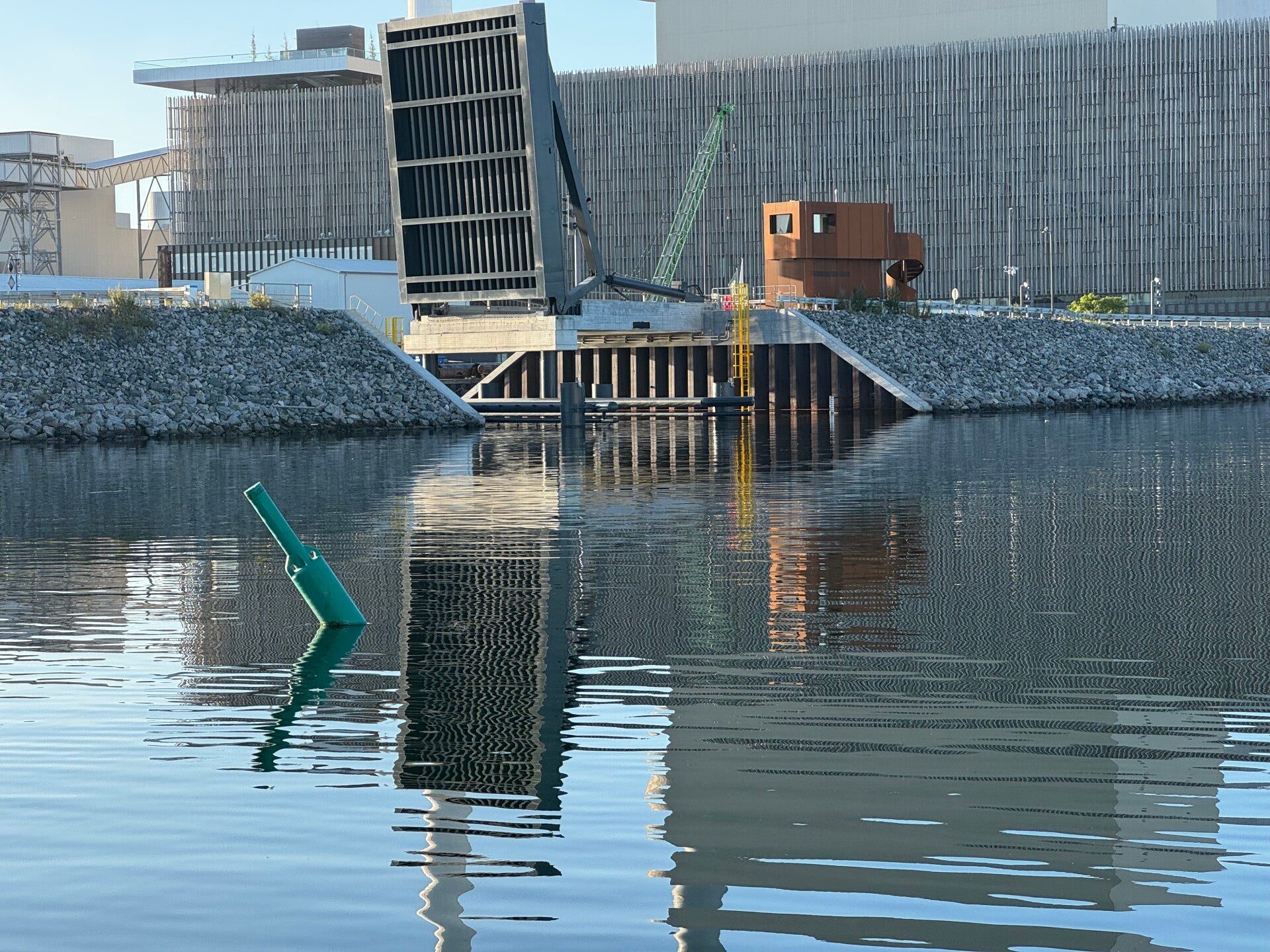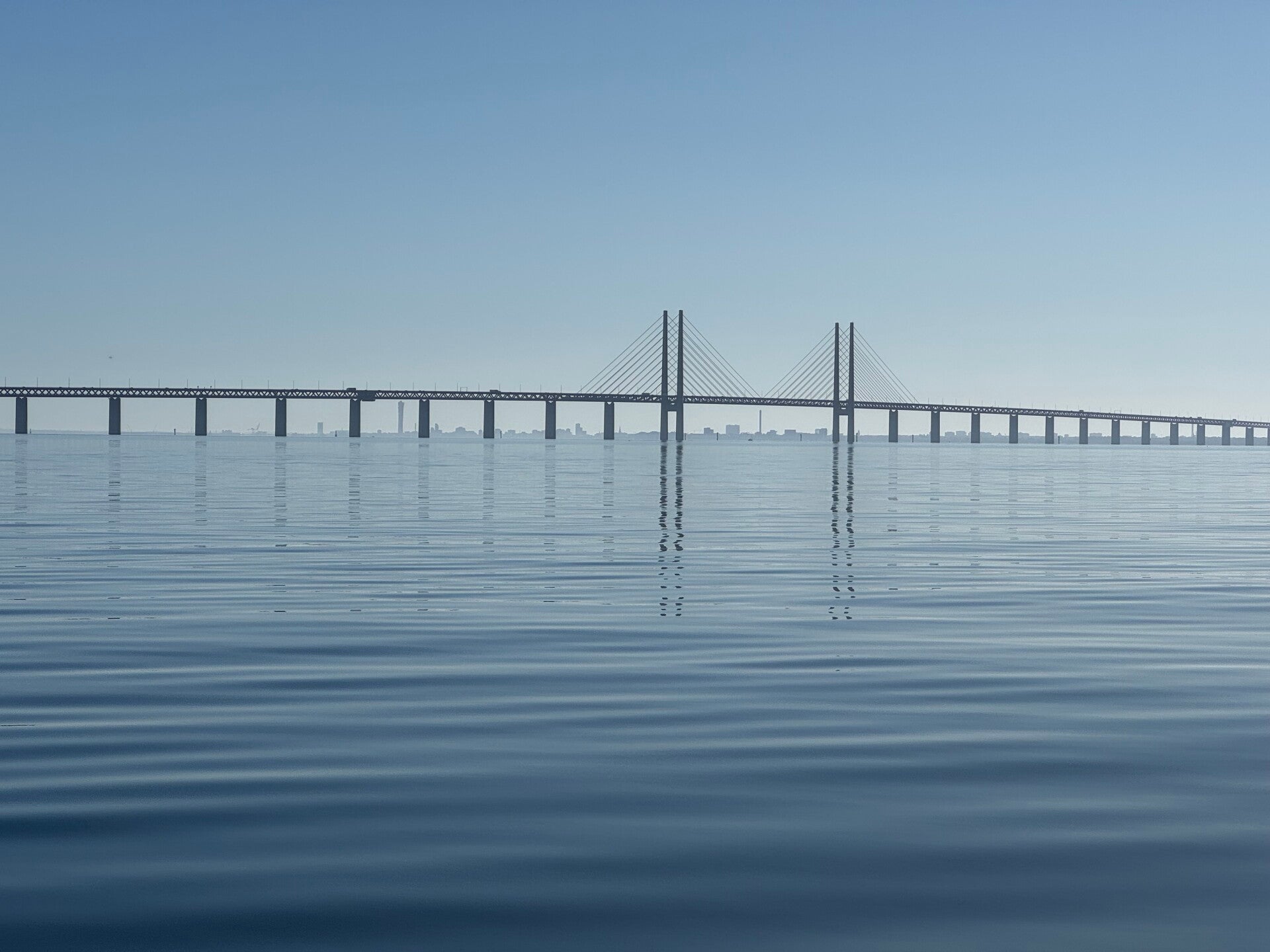 Vi havde sat vækkeuret til meget tidligt – klokken fem ringede det, for nu skulle vi til Sverige. Margretheholmsbroen var kun åben til klokken syv, og vi skulle også nå at tanke diesel først. Det var en smuk og næsten vindstille morgen, og mens vi sejlede ud på Øresund, fik vi øje på en hel række lastbiler. De stod næsten som en kolonne og ventede på, at Margretheholmsbroen skulle lukke, så de kunne komme videre med jord, der graves ud i forbindelse med tunnelbyggeriet.