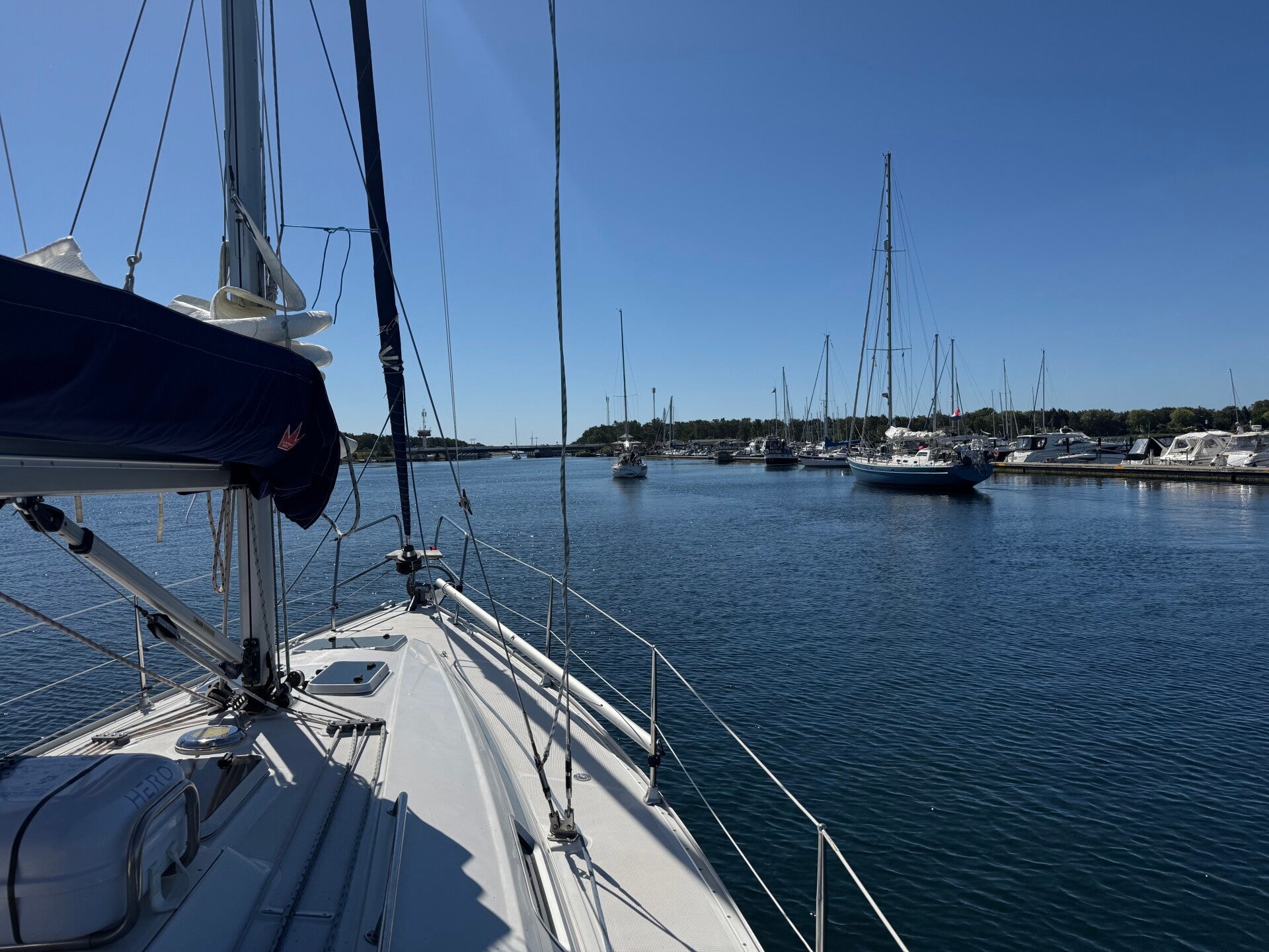 Efter kanalen kom vi ud i Østersøen, hvor vinden tog til, så vi kunne sejle både for sejl og motor. Lidt over klokken 13 ankom vi til Trelleborg, nærmere bestemt Gislövs havn – en hyggelig, lille havn. Vi fandt en god plads og kunne endelig nyde en velfortjent frokost med en kaj-bajer i solen.
