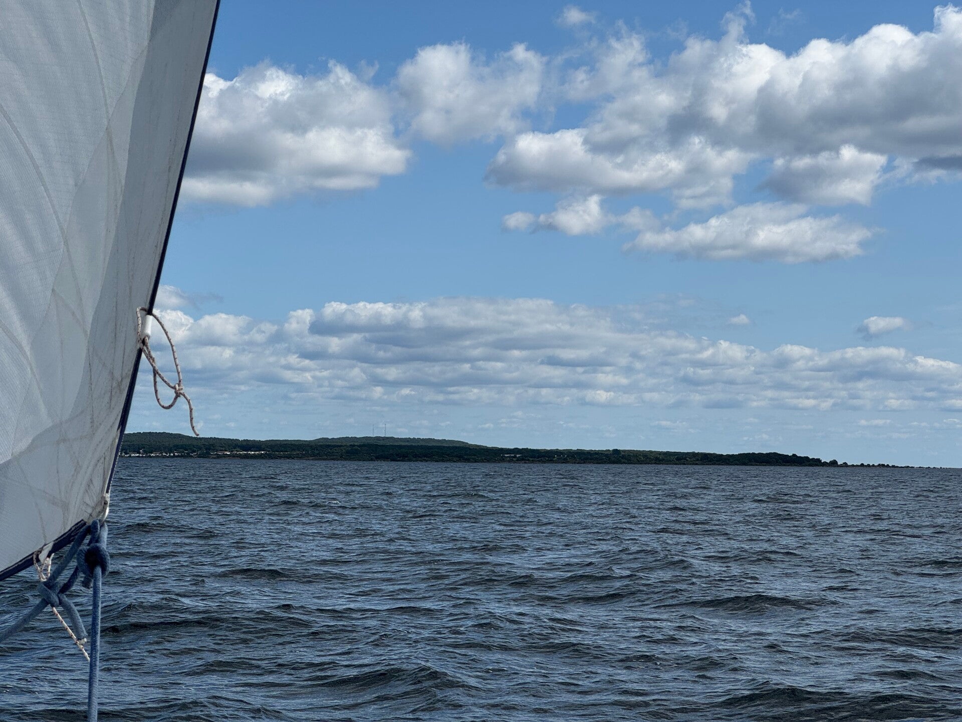 Ved sekstiden næste morgen forlod vi havnen. Straks vi var ude af havneindløbet, satte vi sejl og standsede motoren. Vejrudsigten havde lovet 6 til 9 m/s, og det holdt præcis stik. Vi fik en dejlig tur op langs sydøstkysten af Skåne og ind mod Hällevik i Blekinge län. Synet af Blekinges sydkyst, der dukkede op i horisonten, var noget særligt — solen glimtede over det blå vand, mens sommer-skyerne lå som vat inde over land.