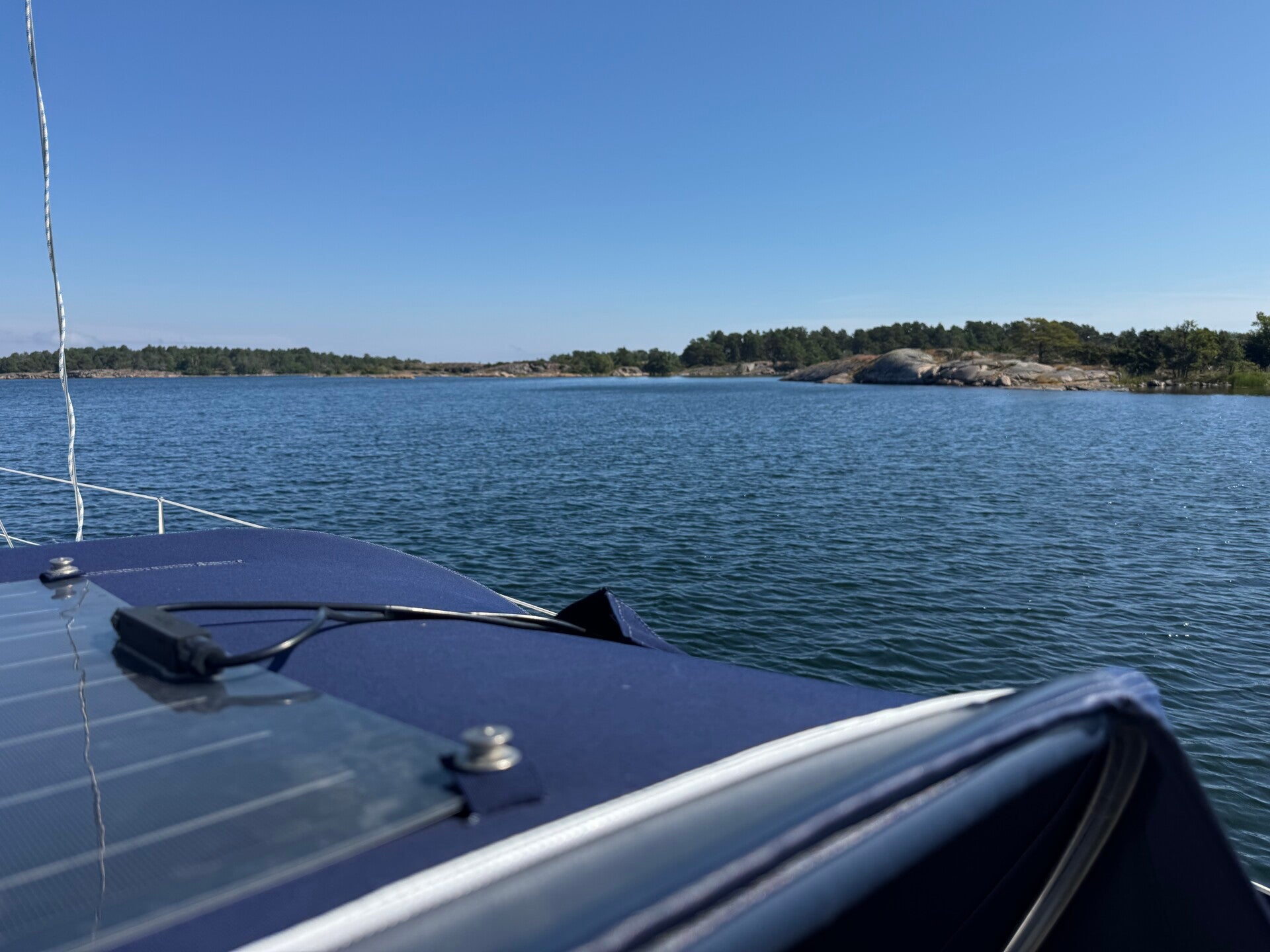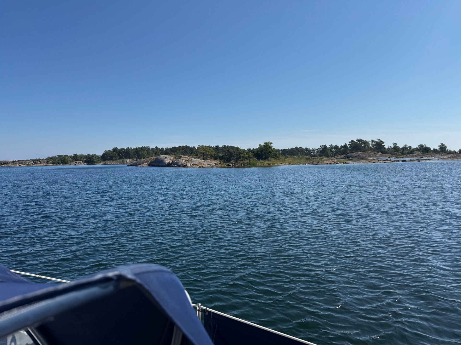 Et par timer senere gled vi ind i skærgården, hvor vind og bølger lagde sig som ved et trylleslag. Skærgården ved Västervik viste sig fra sin bedste side med grønne klippeøer, små bugter og en ro, der kun blev brudt af fugleliv og klukken fra båden.