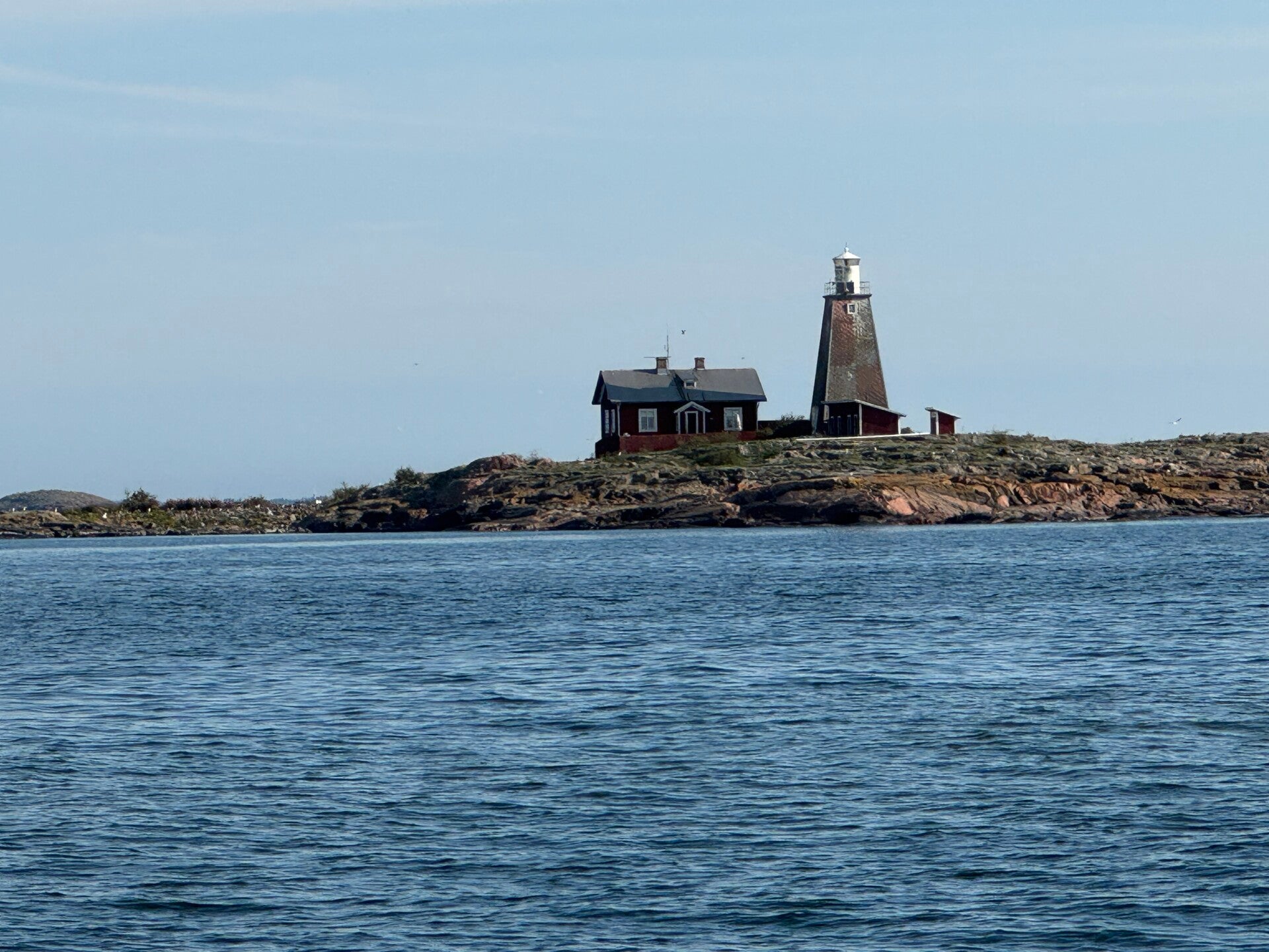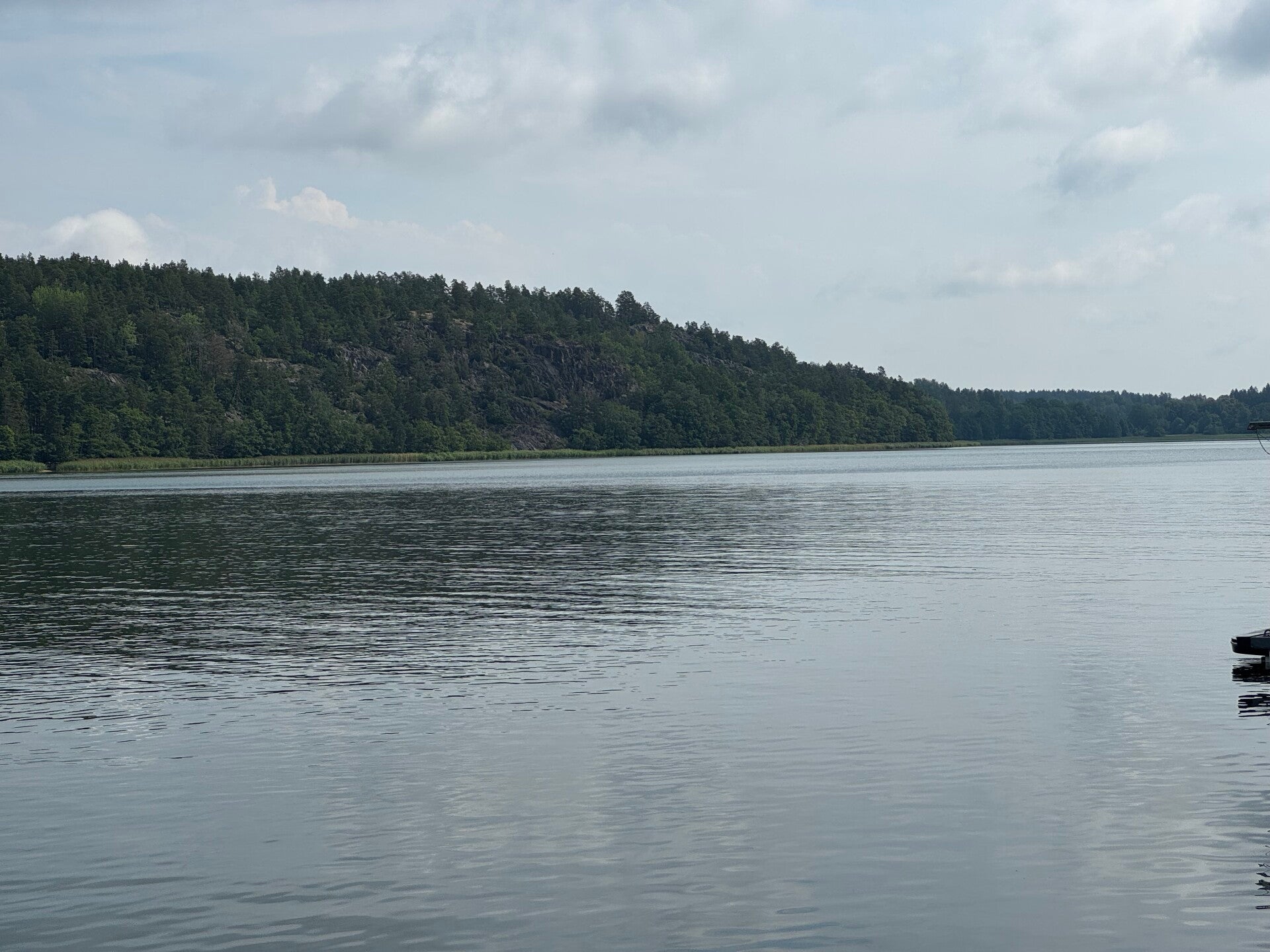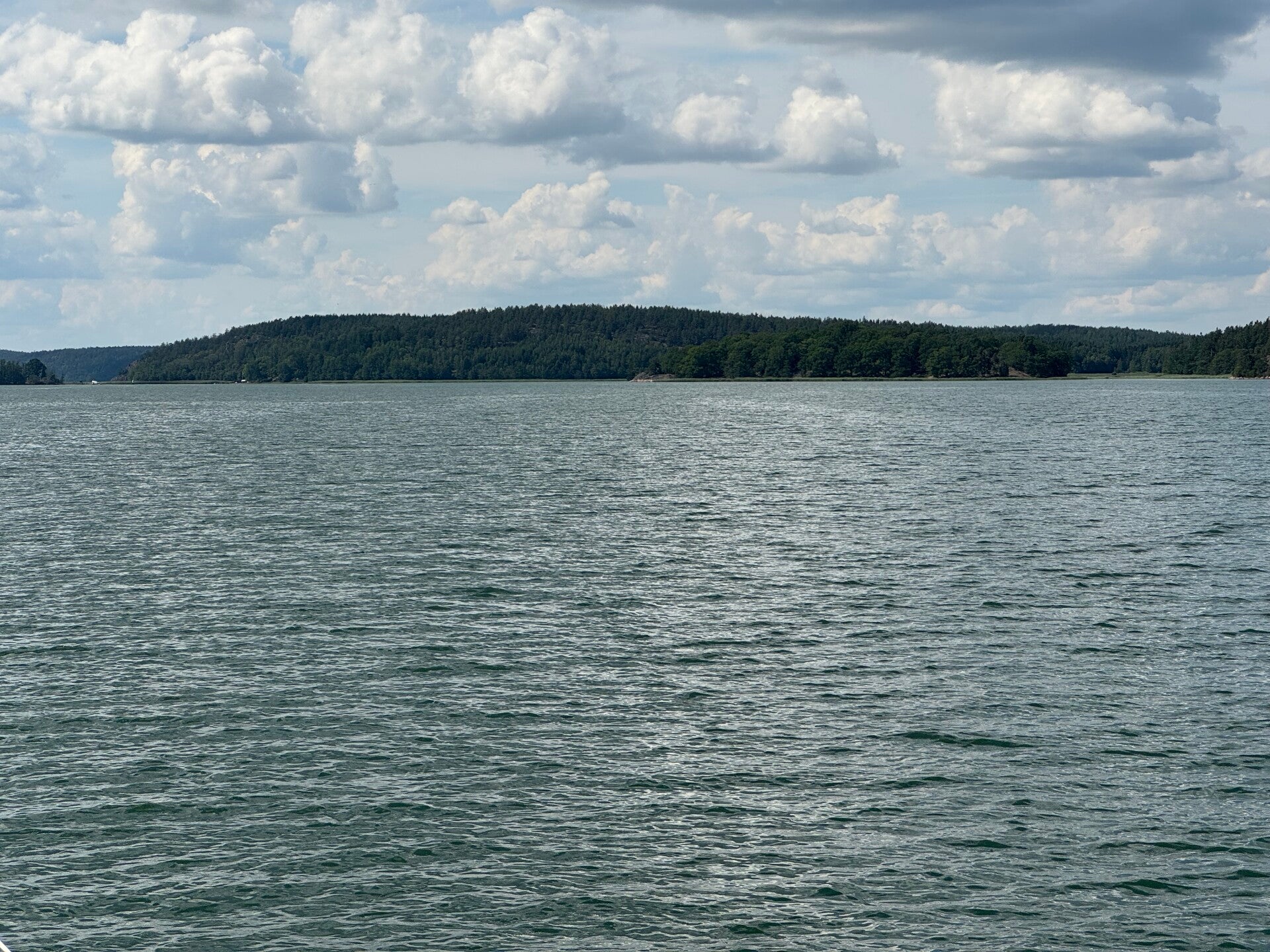 Tidligt om morgenen, klokken seks, smed vi trosserne og gled stille ud på vandet. Vejret var helt perfekt — sommeren havde for alvor fået fat i Sverige, og det mærkedes i både krop og humør. Hele turen foregik for motor, og det første stykke sejlede vi uden for Skærgården. Undervejs flød store mængder af pollen som gule skyer på vandets overflade — et syn, der mindede os om, at naturen også er på sit højeste lige nu.