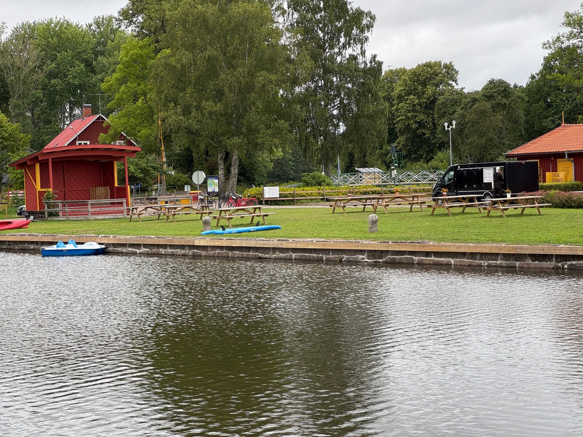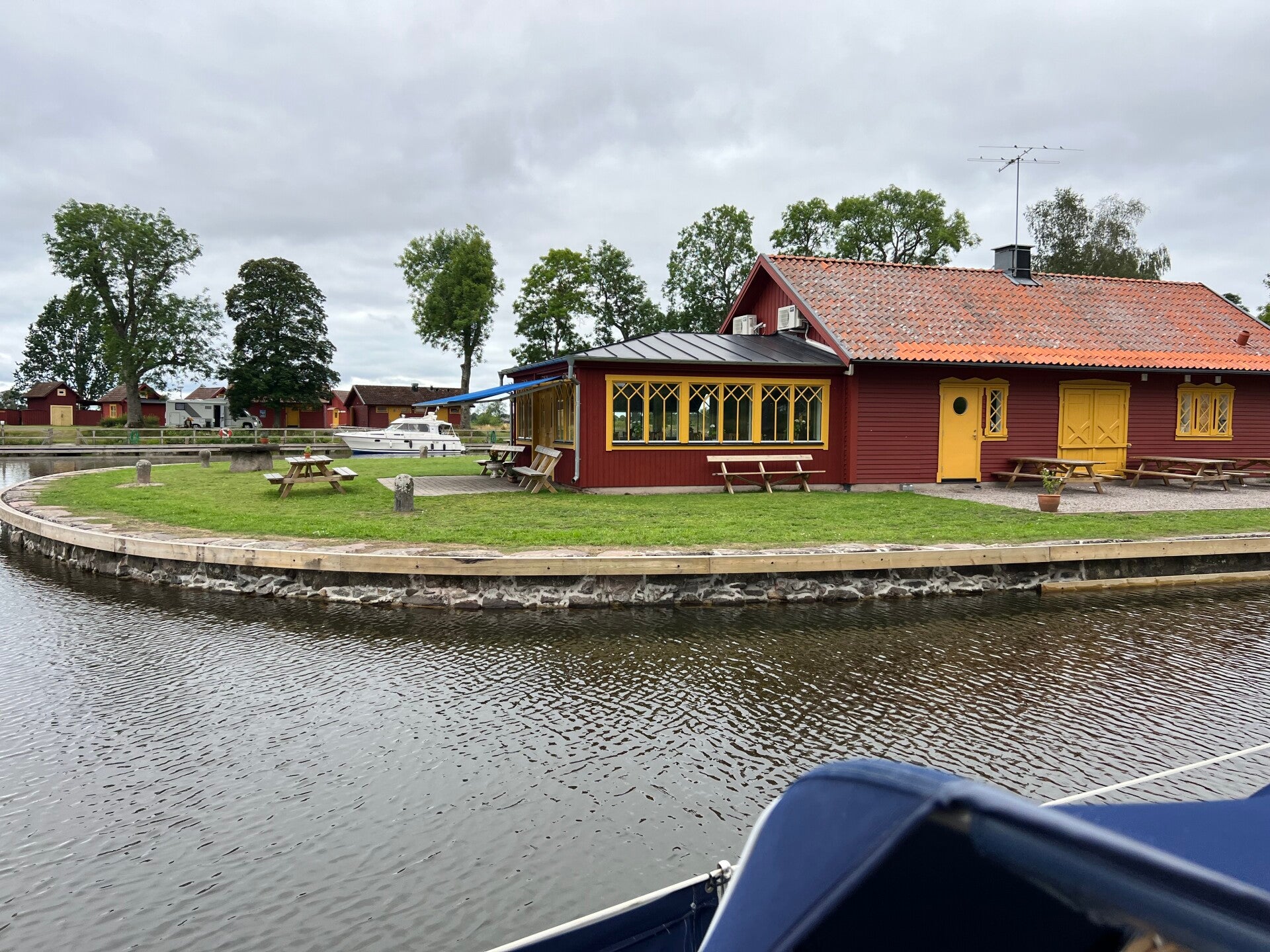 Vi vågnede op i den lille, fredelige havn i Vassbacken, en charmerende og stille perle langs Göta Kanal. Her var ikke meget andet end det nødvendige – en lille sanitetsbygning, en hyggelig café/restaurant, som også fungerede som information for den nærliggende campingplads. Havnen var især populær blandt autocampere, og vi bemærkede, at der næsten altid holdt nogen og betragtede os “danske sejlere” med nysgerrige blikke.