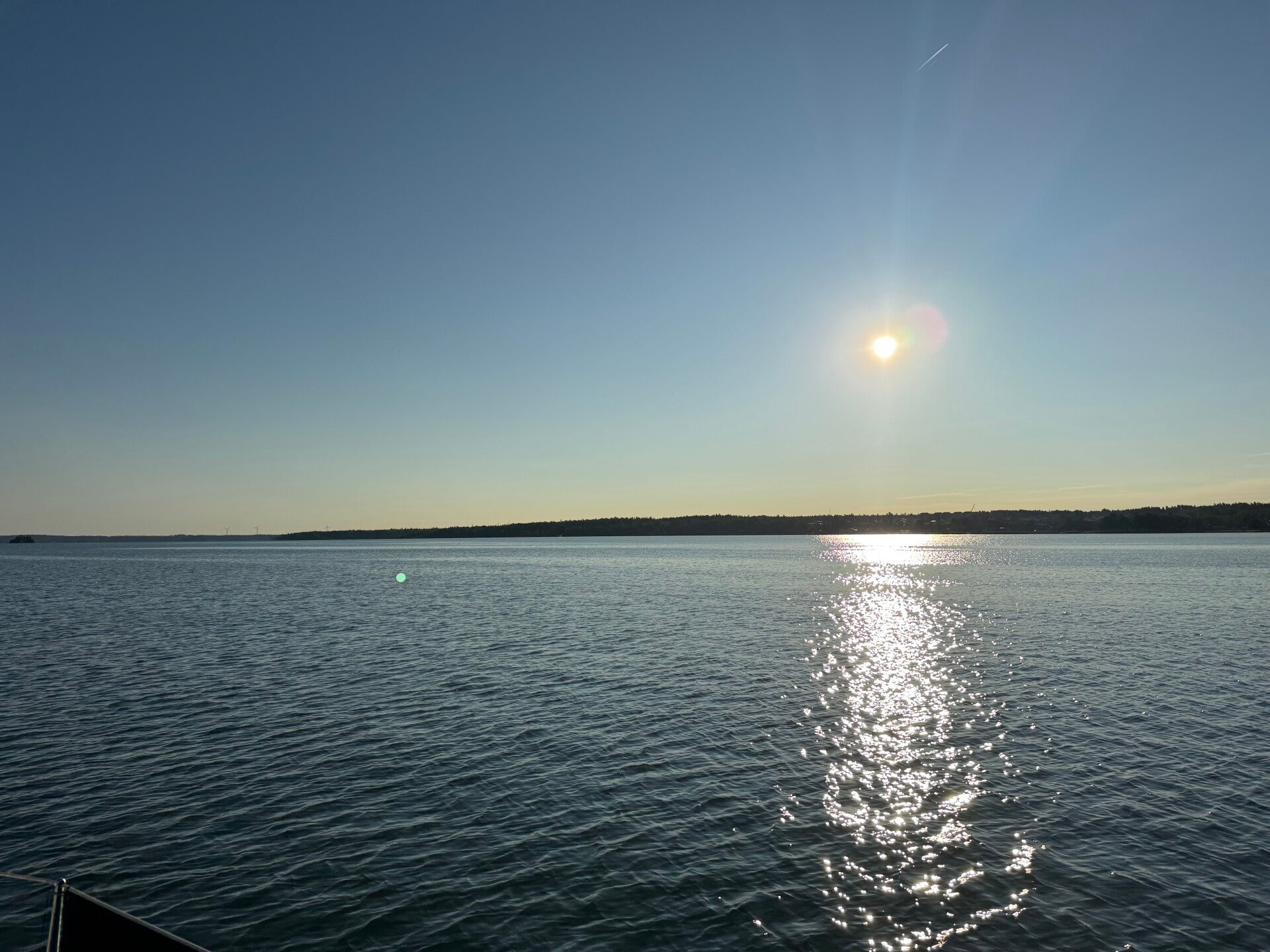 Vi forlod havnen omkring klokken syv om morgenen og satte kursen ud på Vänern. Søen åbnede sig foran os som et glitrende hav, med små øer og skær, der dukkede op undervejs. Vejret var strålende – stille vind og sol fra en skyfri himmel – så sejlturen føltes næsten meditativ.