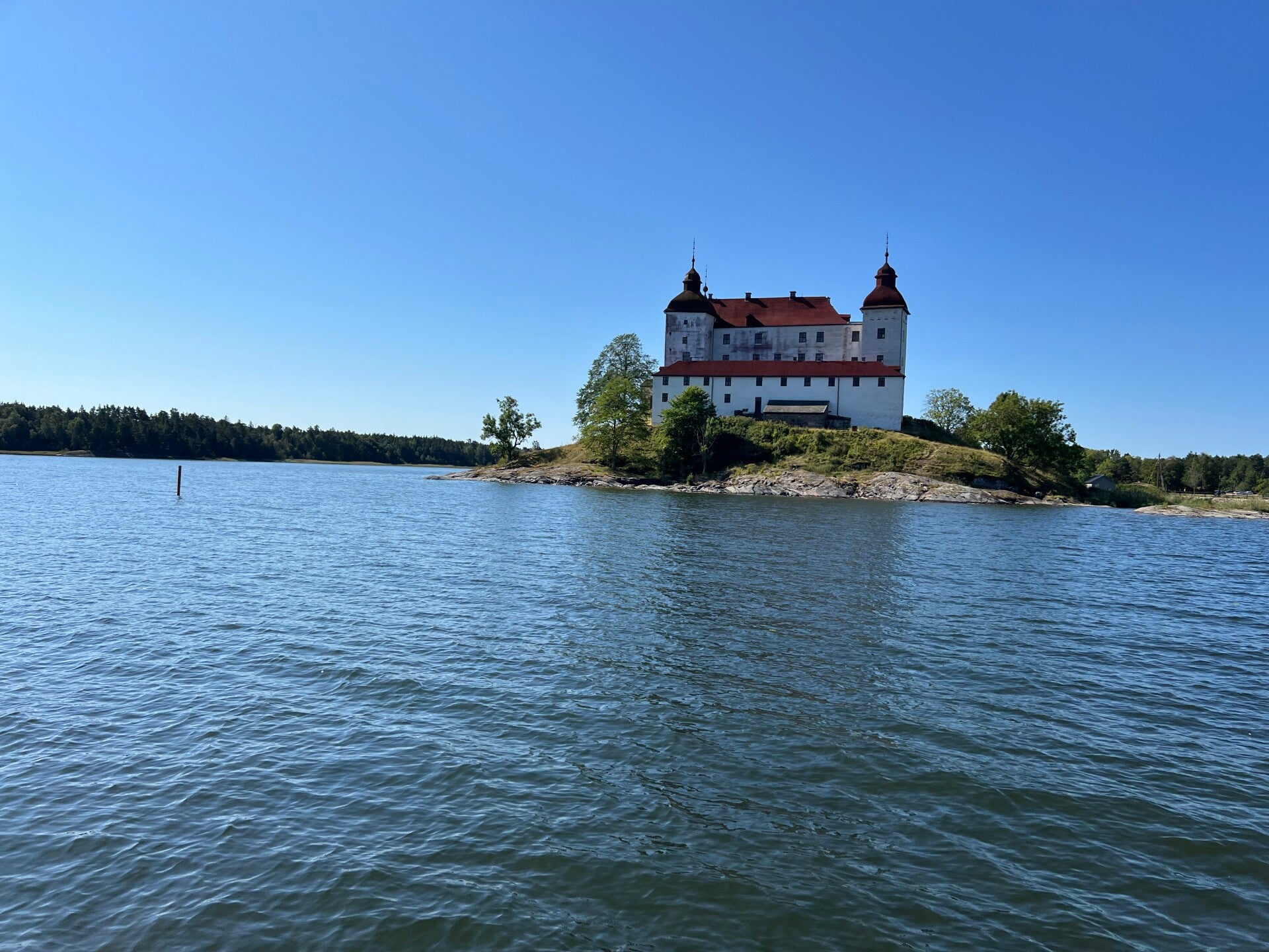 Efterhånden som vi nærmede os, kunne vi i lang tid skimte Läckö Slot knejsende i horisonten. Det hvide slot, omgivet af grønt og vand, blev gradvist større, indtil det stod klart og majestætisk foran os.