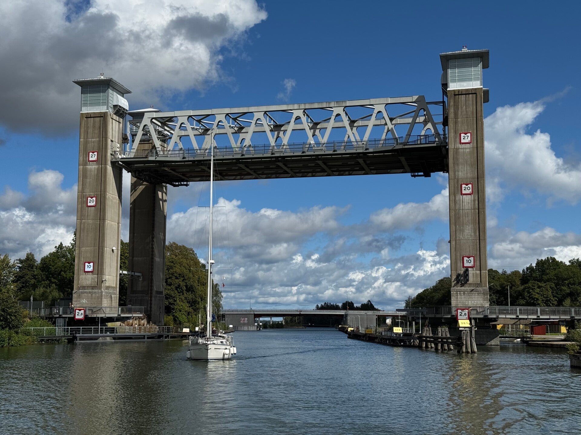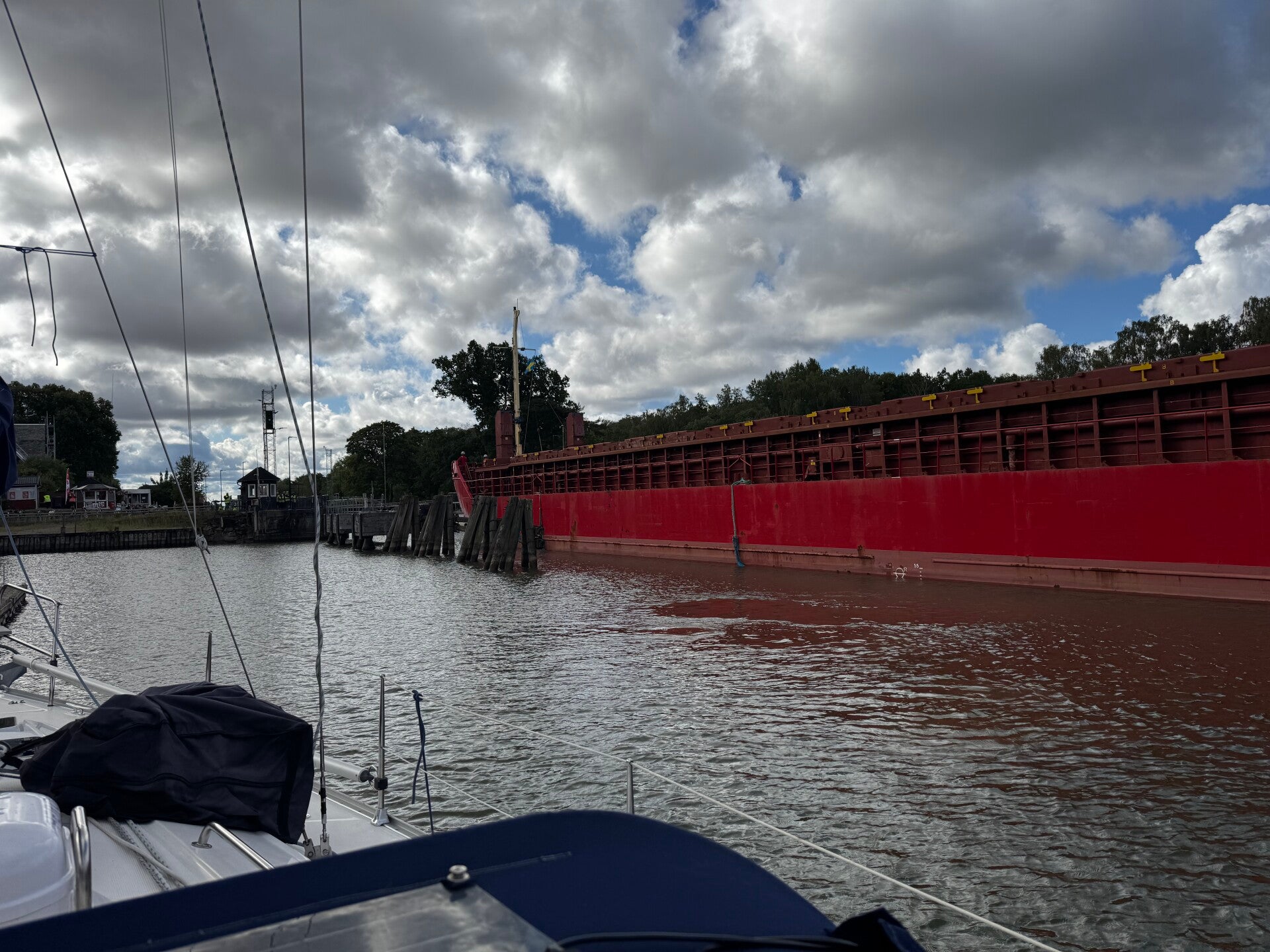 Da vi vendte tilbage til Fru BIBI, havde endnu en båd lagt til – et tysk par, som vi også faldt i snak med. De fortalte, at de håbede at nå hele vejen til Göteborg samme dag. Kort efter var fragtskibet kommet igennem, og det blev vores tur. Vi blev sluset igennem sammen med to andre tyske både. Slusen var enorm, men der var rigelig plads, så det hele gik stille og roligt.