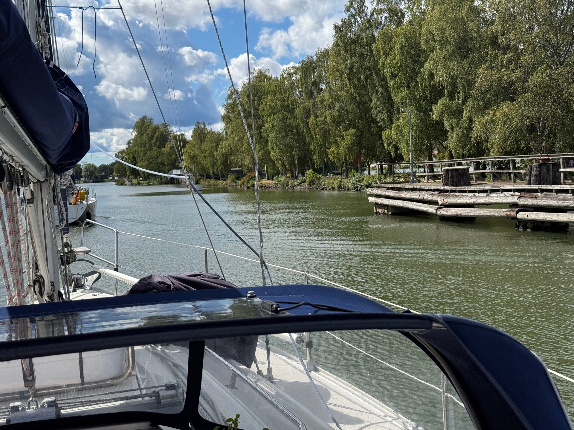 Med tanken fuld satte vi kursen mod den første sluse. Her måtte vi dog vente, da et fragtskib skulle igennem før os. Vi fortøjrede Fru BIBI ved ventekajen og gik en tur op for at se på slusen. Den var markant større end de sluser, vi hidtil havde passeret. Oppe ved slusen mødte vi en større flok mennesker i gule veste, alle på knallert. Til vores overraskelse hilste én af dem på dansk – det viste sig at være en dansk knallertklub på tur i Sverige. Stemningen var livlig, og vi fik os en hyggelig snak med dem.