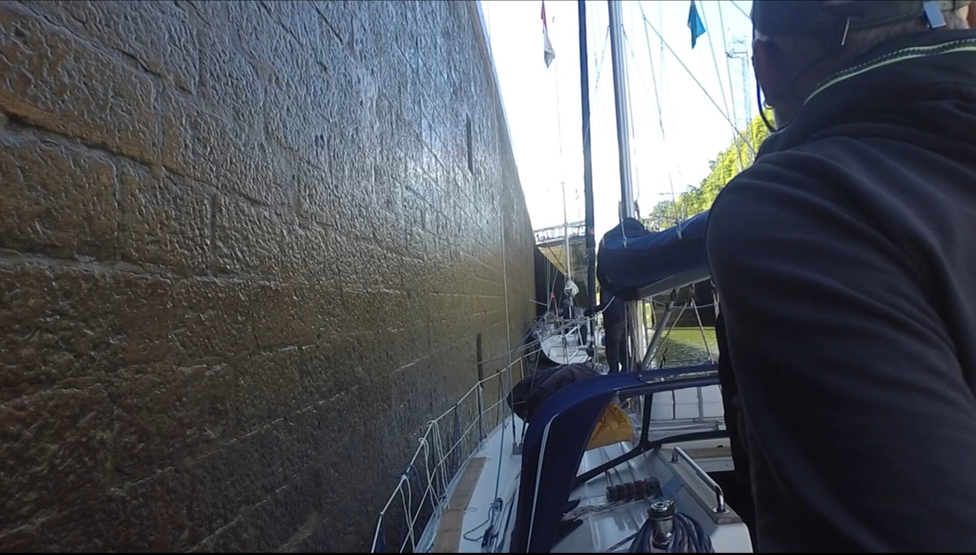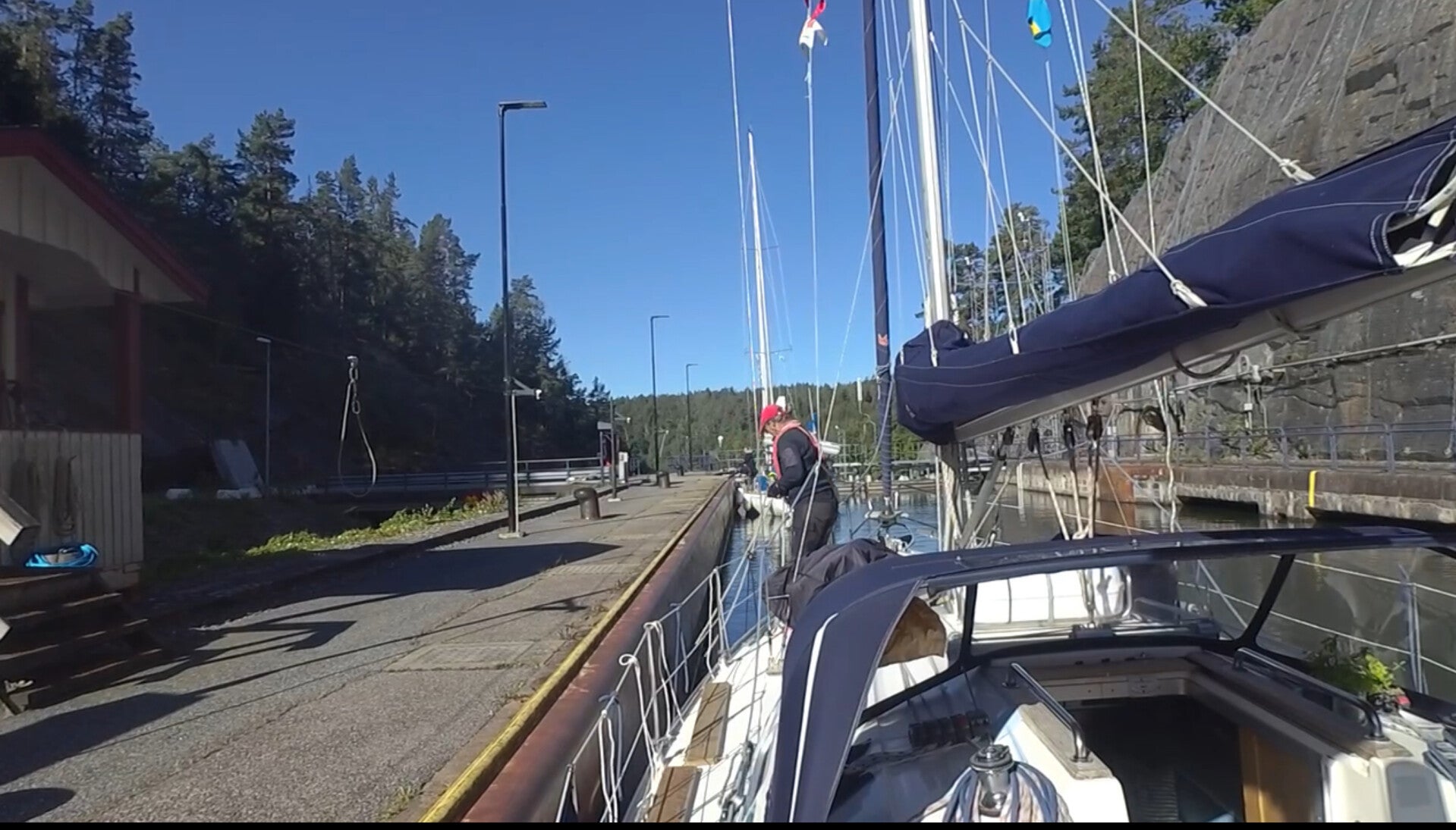 Men allerede i den næste sluse gentog det sig: den svenske båd manøvrerede uforudsigeligt, og igen måtte vi sætte FRU BIBI fuld bak for at undgå uheld. Heldigvis gik det uden skrammer, og vi besluttede os for at holde ekstra afstand resten af vejen. Herefter forløb sluserne stille og roligt.
