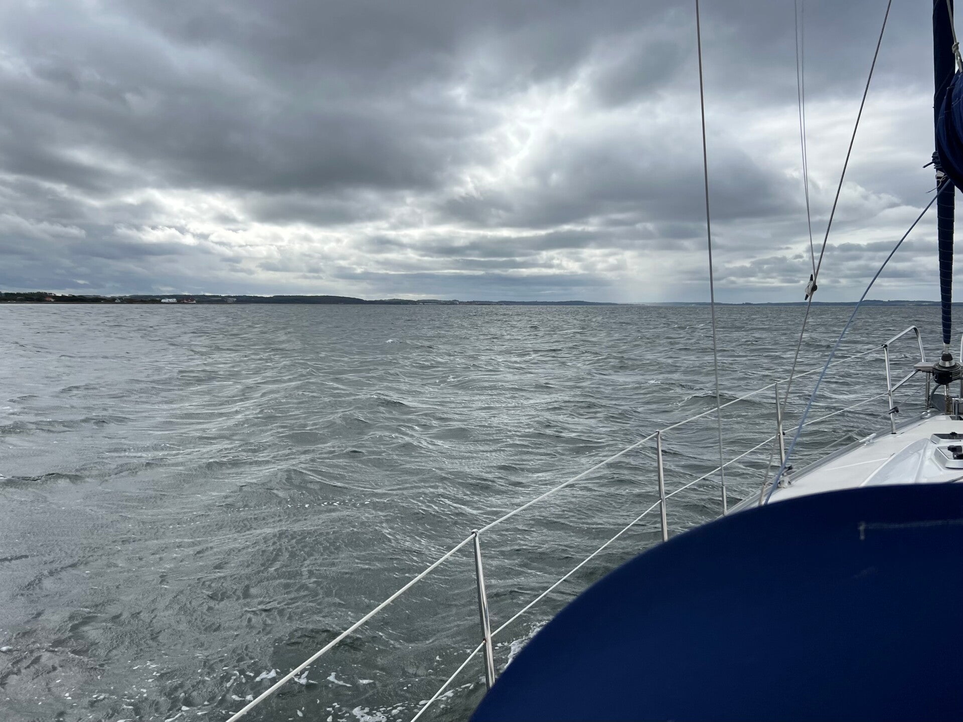 Turen gennem Limfjorden mellem Aalborg og Nibe bød på modvind – 10 til 16 meter i sekundet, så det blev primært for motor. Strækningen er smuk, selv i hårdt vejr: fjorden snor sig bred og flad mellem lave kyster, hvor rørskove og små skovpartier veksler med marker og bakker. Små øer og vige giver et varieret indtryk, og selv på en blæsende dag er det let at fornemme roen, som fjorden rummer.