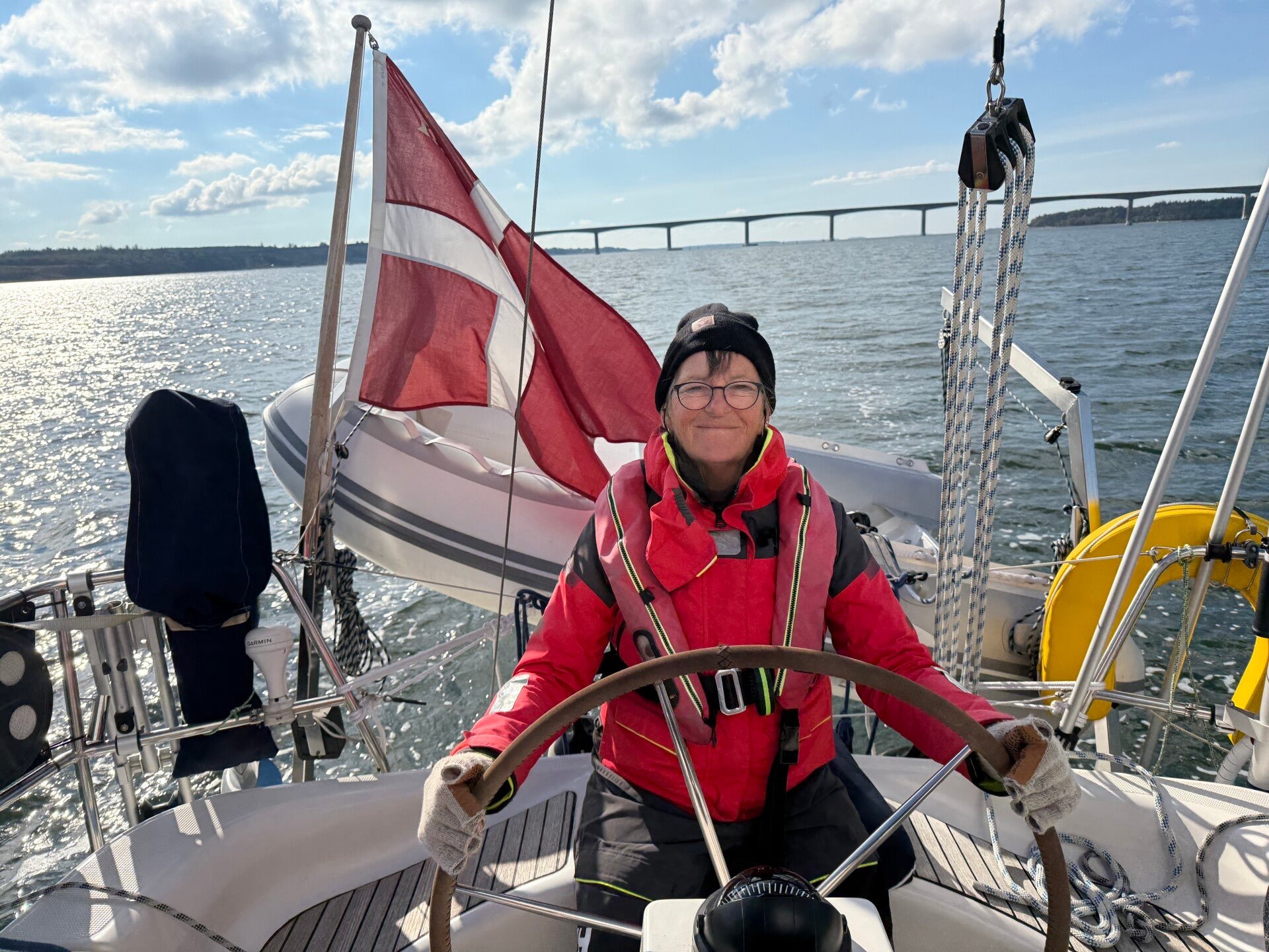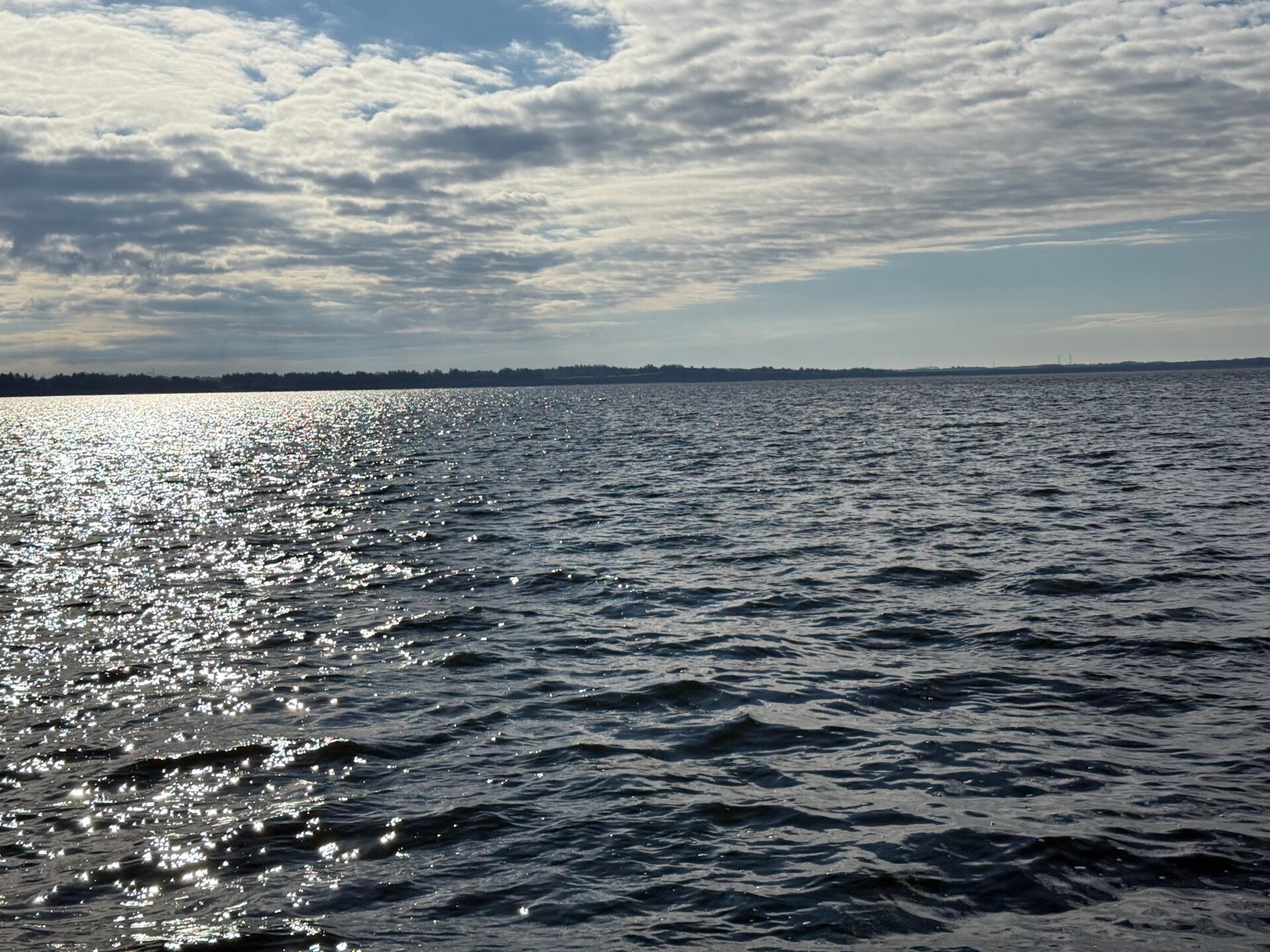 Lidt over otte kastede vi fortøjringerne, og en let vind hjalp os elegant rundt i havnen. Storsejlet kom hurtigt op, og vi satte kursen mod Venø Bugt – i første omgang med både sejl og motor. Da vi havde passeret Venøfærgen og var kommet ind i bugten, rullede vi forsejlet ud og standsede motoren. Vinden var som skabt til os, og båden gled perfekt fremad i solskinnet.