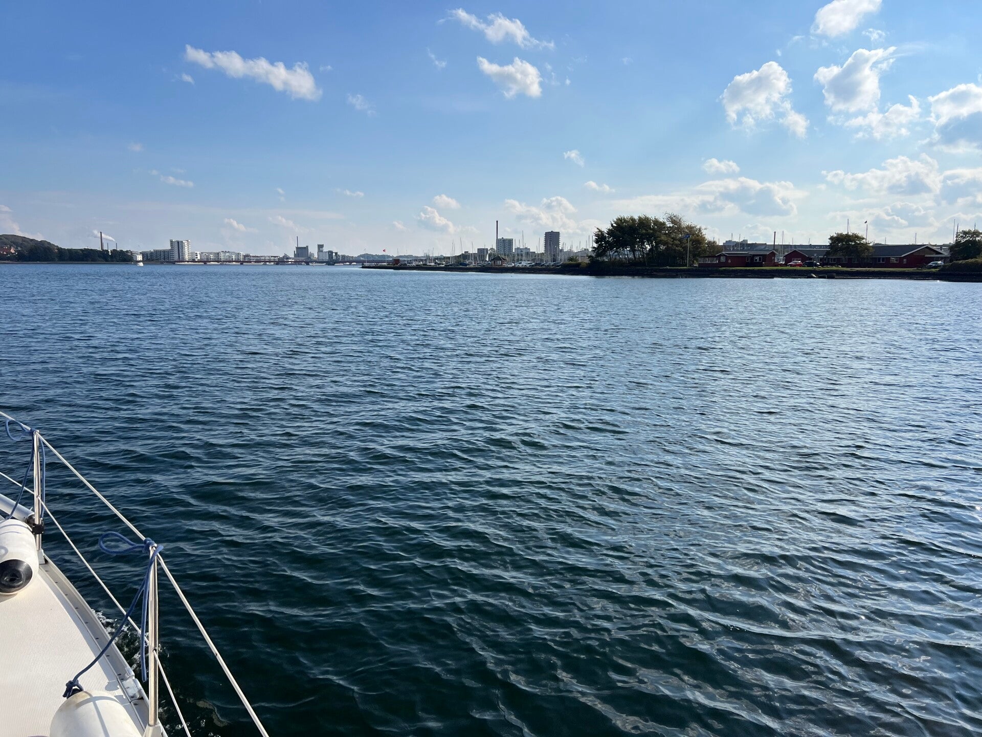 Så snart vi var gennem broen, foldede vi alle sejl ud og standsede motoren. Vinden var perfekt – 4 til 5 meter i sekundet fra syd, præcis som man drømmer om, når kursen er sat mod Aalborg. Limfjorden mellem Aggersund og Aalborg er et smukt stræk: en blanding af åbne fjordvidder og snævrere løb, hvor land og vand mødes i rolige horisonter. Fru Bibi gled støt fremad, båret af vinden og solen, og det var som om, tiden stod stille.